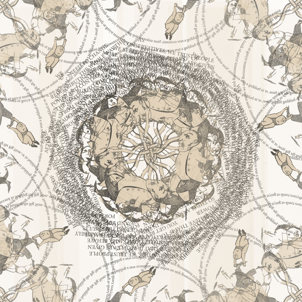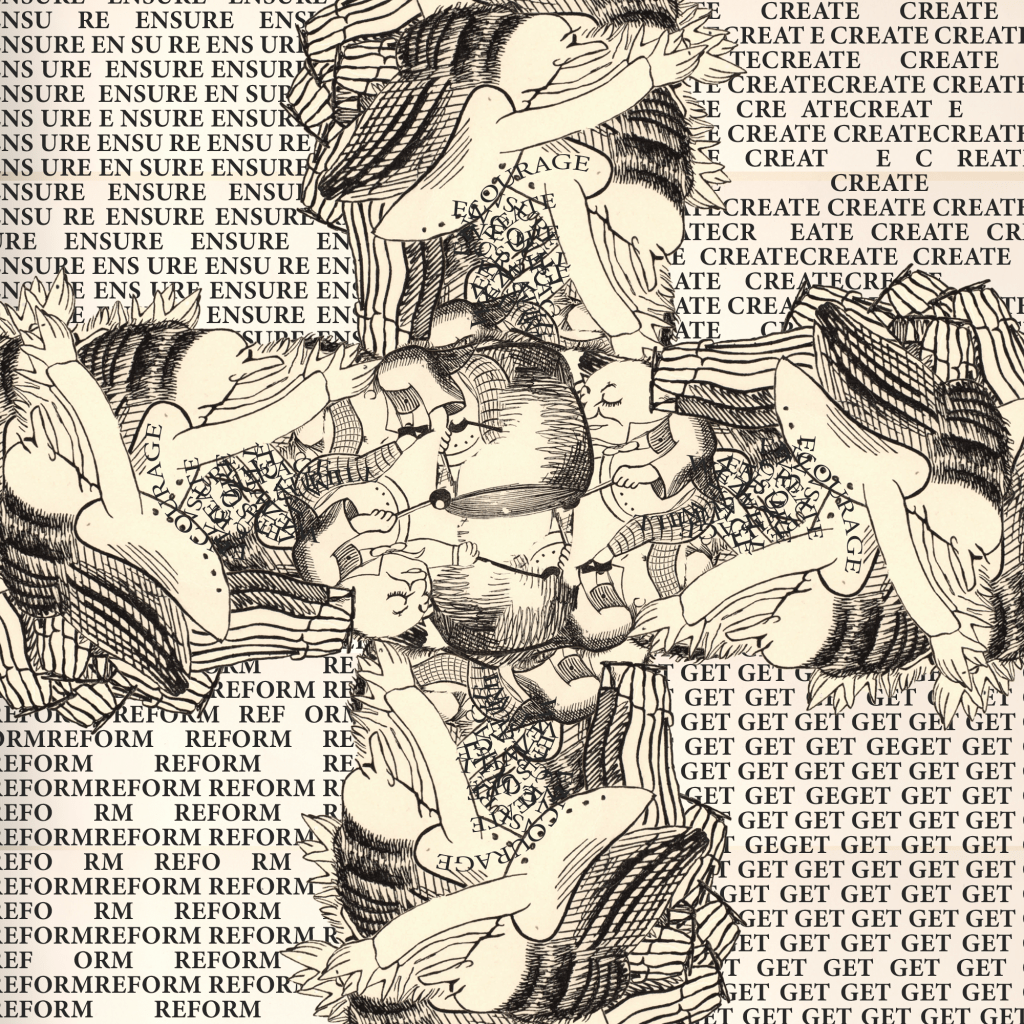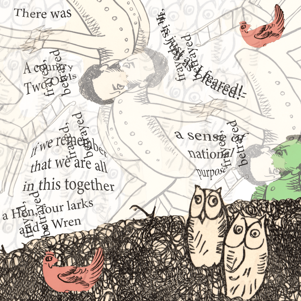 Each title is taken from the headings and subheadings of the manifesto, titled Invitation to Join The Government of Britain, and all drawings and sketches are cut ups of Lear’s originals.