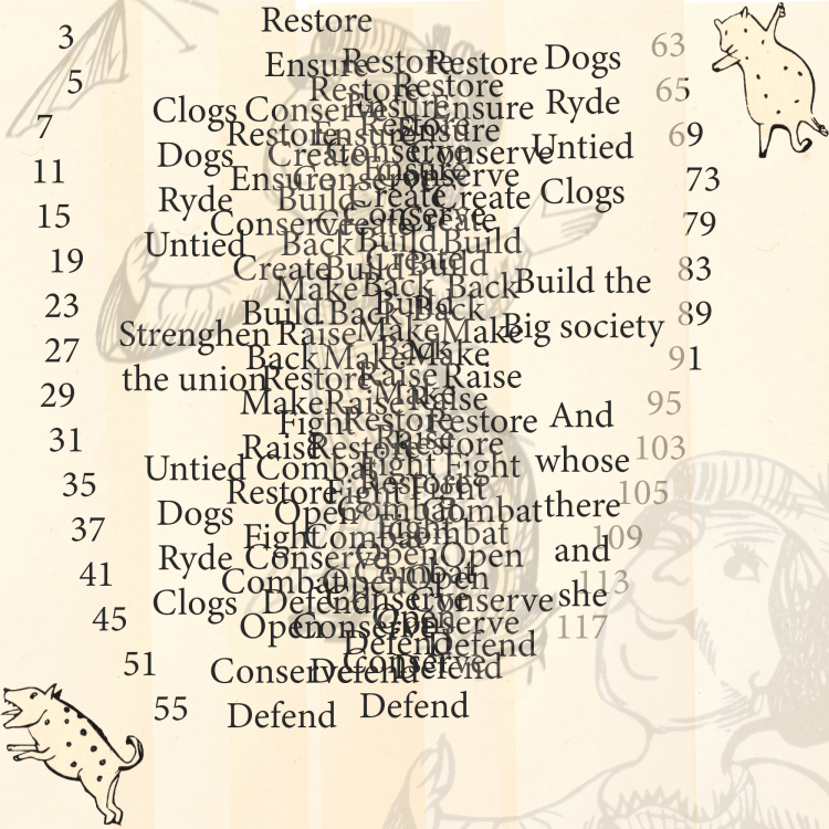 During the locked-down summer of 2020 I found a copy of The Conservative Manifesto 2010 outside a recycling bin in Westminster. Around the same time I ordered an 1895 edition of Edward Lear’s The Nonsense Poems. This sequence works through each page of both books to explores the similarity of rhymes.